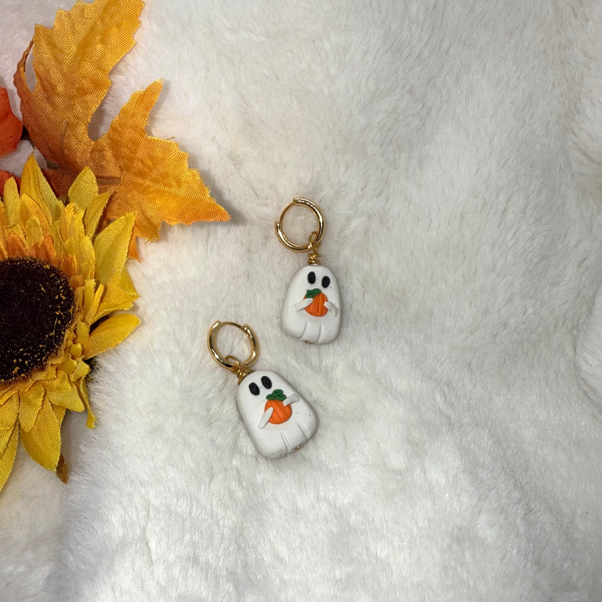 Curious Gosht with a pumpkin. 10k. gold plated hoops. Simply but attractive design for a gift in these Halloween Season.